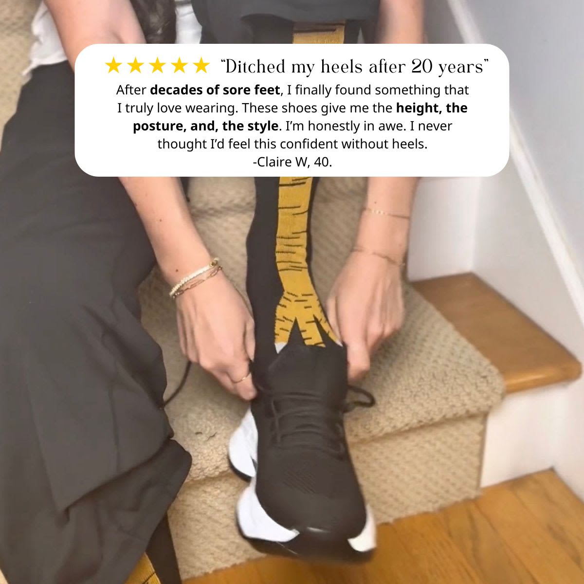 Heels give height but also deliver blisters, sore calves, and wobbly steps. Onne’s ergonomic insole technology delivers a comfortable lift with shock absorption, arch support, and breathable cushioning. In wear tests, women wore them for 10+ hours without the foot pain and loved how comfortable they are.